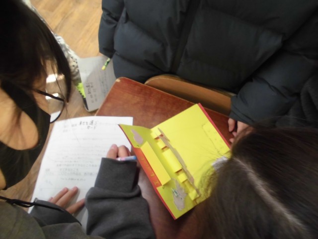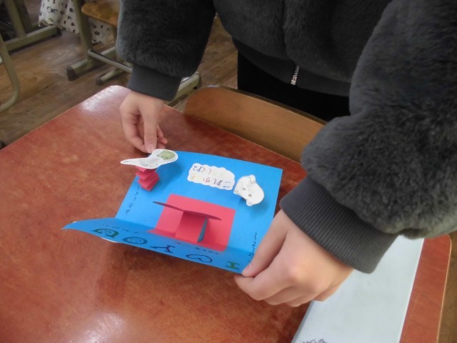 図画工作「幸せを運ぶカード」が完成しました。今日は、自分の作品で見てほしいところや自分が工夫したところを発表した後、友達の作品を鑑賞しました。「凄い」「おお!」「きれい」など思わず言葉を出してしまうほど楽しい作品ができました。参観日に見ていただきます。