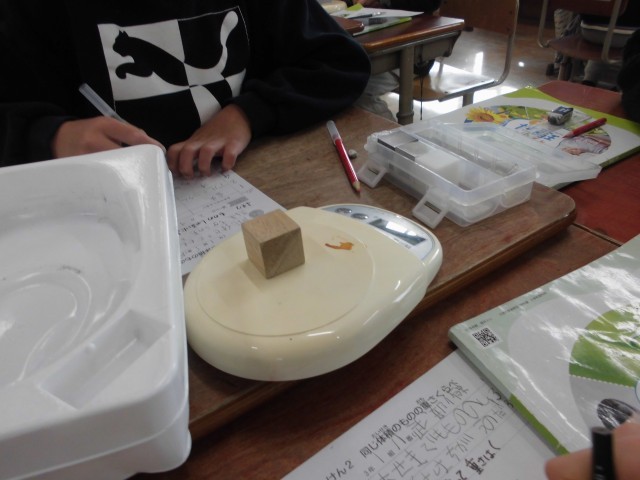 最後に電子てんびんを使ってアルミ缶とスチール缶、砂糖と塩の重さを量りました。そして、この実験を通して同じ体積でも物の種類が違うと重さは違うことが分かりました。実験をする時に「予想、その理由、結果からわかること」などがしっかりとできるようになってきました。