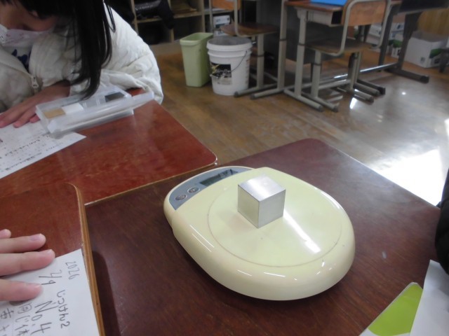 理科は3年生の最後の単元「ものの重さ」の実験をしました。体積が同じ物は、重さも同じなのだろか。鉄、アルミニウム、木、プラスチックの4つで調べました。最初は、目で見て、次は、手でもってみて、重い順に並べてみました。1鉄2アルミニウム3プラスチック4木の順だと予想が多かったです。