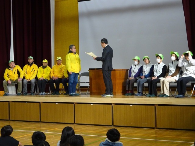 毎日の登下校の時間に、交通安全協議会の皆さまや地域の見守り隊の皆さまにご協力いただき、子どもたちが安全に学校へ通えるよう温かく見守っていただいています。子どもたちのあいさつに笑顔で応えてくださったり、声をかけていただいたりと、日々の安全を支えてくださる存在として、大きな力になっています。 「交通安全感謝の会」では、こうした地域の皆さまのご尽力に、子どもたちと教職員一同が感謝の気持ちを伝えました。代表児童の言葉や、手作りのメッセージカードなどを通して、毎日安心して登校できる喜びを伝える時間となりました。3年生が、全校の代表としてカードを作成し、花束を贈呈しました。