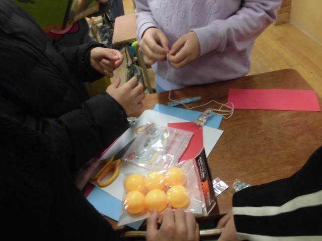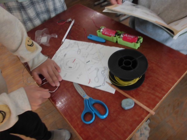 理科の学習のまとめとして、今まで学習したことをつかっておもちゃ作りをしています。めいろ、かけっこウサギ、魚つりゲーム、どきどきわくぐり、ピンポンロケットです。グループに分かれて、いろいろ試しながら進めています。完成したらどこかの学年を招待する計画です。
