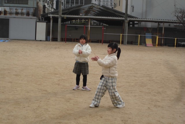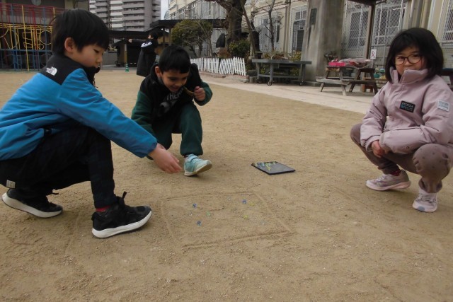 この日は、竹とんぼ・おはじき・ビー玉・こま・羽子板を教えてもらい、色んな遊びに挑戦しました。