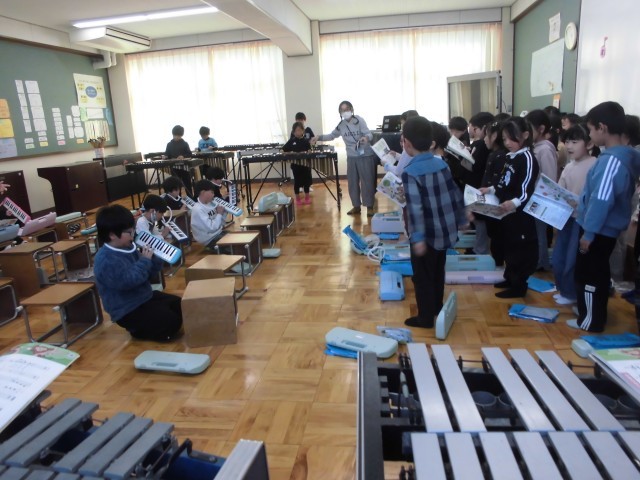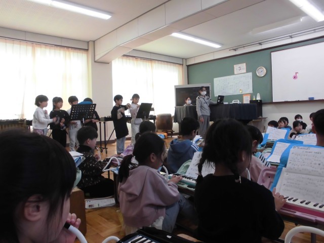1,2年生の音楽会は、1年生から始まりました。鍵盤ハーモニカ、すず、タンバリンなどを使って演奏してくれました。ハンドベルの演奏は、とても上手で2年生がびっくりしていました。2年生は、あいあいの曲を楽器を増やして演奏してくれました。最後に2年生の演奏に合わせて「アイアイ」を1年生が歌いました。一緒に音楽を楽しむことができ、すてきな交流になりました。
