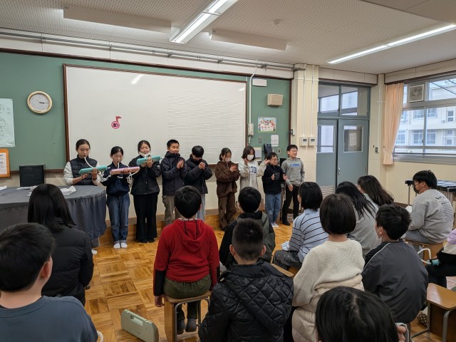 今年度最後の音楽の学習では「ギャラクシー~銀河をこえて~」の発表会をしました。グループごとに、鍵盤ハーモニカの演奏とクラッピングでのリズム打ちを発表しました。クラッピングは2種類の打ち方があるので、お互いにつられないようにするのが大変そうでしたが、どのグループも楽しんで発表することができました。