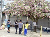 観察する生き物には、桜の木でも、種類によって咲き方が異なるようで、一方はすべて葉っぱでしたが、一方はまだまだ、ピンク色が目立っているようで、子どもたちの観察を1年間通すことで、咲き方の違いも見えてくるのではないかと思いました。