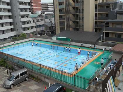 プールの中やプールサイドをがんばってブラシでこすり,ぴかぴかのプールになりました。