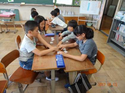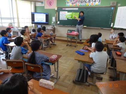今日は久しぶりの外国語活動。マックス先生と一緒に学習しました。色や形の言い方を英語で言う練習をします。「red,pink,yellow…」日本語の「レッド」「ピンク」「イエロー」と発音がどんな風に違うかを考えました。学習の最後には自分だけの暑中見舞いカードを作ります!楽しみですね♪