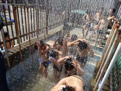 「つめたい!」「気もちいい!」と笑顔いっぱいの子どもたち。しっかりと水に慣れることができました。