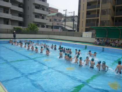 水位が増しました。恐る恐る入ってみたプールでしたが,水遊びをするうちにだんだん慣れてきました。