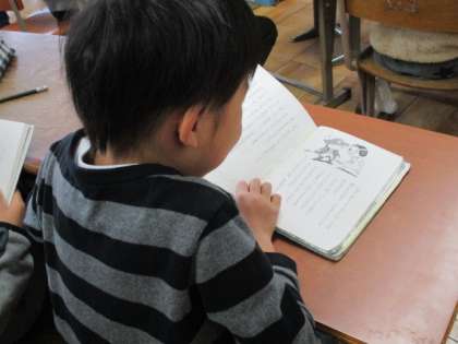 文字がいっぱいの本を楽しむ姿…