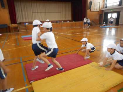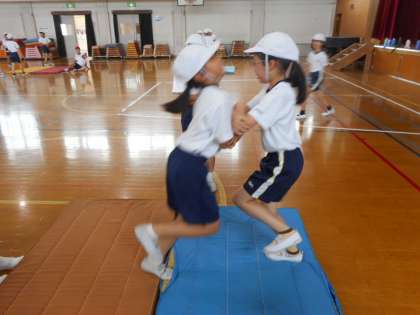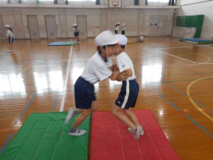 足はけんけんで,手を使わない「けんけんずもう」をしました。「きゃっきゃ」と声をあげて楽しそうにしながらも,どうしたら自分より身長の高い友だちに勝てるのか考えていました。授業の最後には,「もっとやりたいー!!」と大喜びでした。