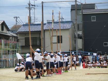 3年生は棒引きです。竹の棒をすばやく引っ張る速攻にびっくり。一つひっぱり終えると次の棒へ応援に…。対戦後は仲良くハイタッチして,一人一人がポーズを決めて,とてもとても素敵でした。