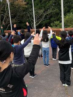 ラジオ体操の後,学校紹介ではクイズを出して,