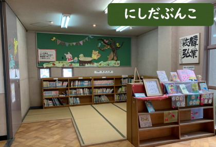 「にしだぶんこ」は, げんかんの ちかくに あります。 1ねんせいの きょうしつまでに あるので, つぎに がっこうへ きたときには さがしてみてね。