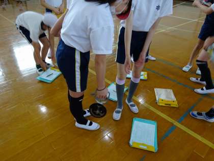 体力テストを実施しました。今回は「ソフトボール投げ」と「握力」の測定の様子です。少しでも記録が伸びるように子どもたちも精一杯頑張っていました。