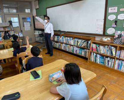 図書館司書の花山先生からお話をいただいています。本好きになってほしいです。
