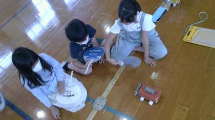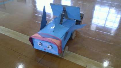 図画工作科の「ゴーゴードリームカー」の学習の最後に鑑賞をしました。今回は「風の力で」動く車ということで,みんな団扇をもち,仰ぎながら車の動きや飾りの様子など,それぞれの作品を味わっていました。一生懸命作った作品。みんなに見てもらえてよかった!!