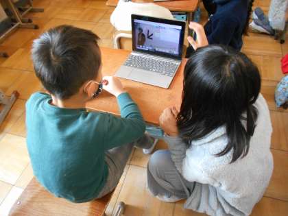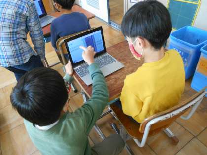 町探検でインタビューして分かったことを,1年生に発表しました。GIGA端末を使ってロイロノートにまとめた資料を見せながら話しました。行く前は緊張している様子でしたが,1年生に感想や質問を言ってもらって嬉しそうにしていました。