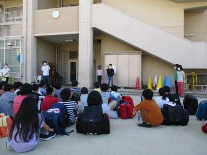 明るく晴れわたった空のもと,5年生の山の家の出発式が行われました。
