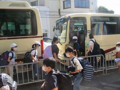 おうちでお見送りをしてくださった保護者の皆様,子どもたちはドキドキしつつも期待のこもった表情でバスに乗りました。