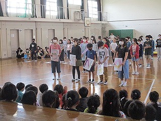 次は5年生の発表でした。英語の学習をもとに、ABCの歌やBINGOの歌をプレゼントしてくれました。1年生も楽しそうに手拍子で参加していました。