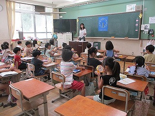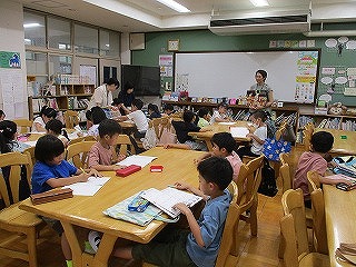 クラスごとに学校図書館へ行きました。学校司書の市川先生が読み聞かせをしてくれました。読み聞かせが終わると、
