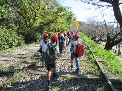 秋晴れのいいお天気の中、社会科の学習で学んでいる、琵琶湖疏水の見学に行きました。まずは、疎水記念館で作った人やその思い、当時使われていた道具などを見ました。動物園でお弁当を食べた後は、インクラインの上を歩いて、疎水のトンネルの出口を探しに行きました。その後、疎水をたどって南禅寺まで。南禅寺の写真は琵琶湖疏水2で紹介します。