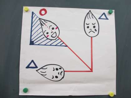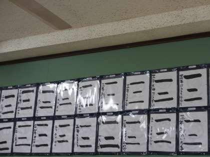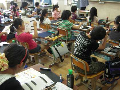 2回目の書写の学習では,「横画の筆使いに気をつけて書こう」というめあてで“一”・“二”を書きました。「始筆」「送筆」「終筆」に気を付け,お手本をよく見て書きました。初めて書いた毛筆の文字を手に,「楽しかった!」という声を聞くことができました。