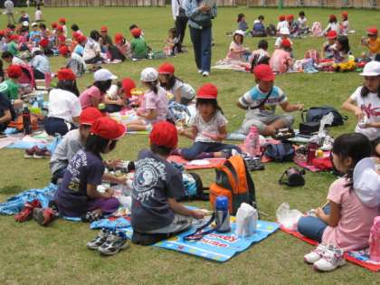 そのあとはグループごとにお弁当タイムです。仲良くなったメンバーでたくさんおしゃべりをしながら食べました。広いしばふで気持ち良さそうに,お昼のひとときを楽しみました。