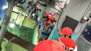 まずは、水族館の裏側での餌やり体験とフンボルトペンギンのウーちゃんの背中にタッチ体験をしました。