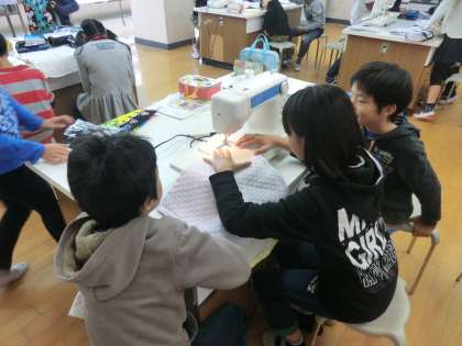 今日の授業では,ミシンを使ってナップザックを完成させました。