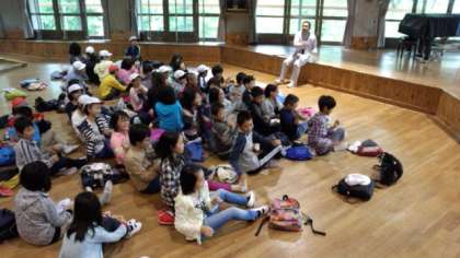 朝食前にオリエンテーションホールで朱ー校だけの