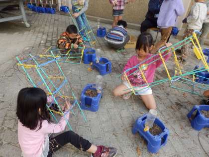 生活科で大切に育ててきたあさがおのツルを使ってリースを作りました。しっかり育っていたため,支柱にまきついていたツルを取るのが大変そうでした。これに,様々なかざりやどんぐりなどをつけて,オリジナルリースに仕上げる予定です。