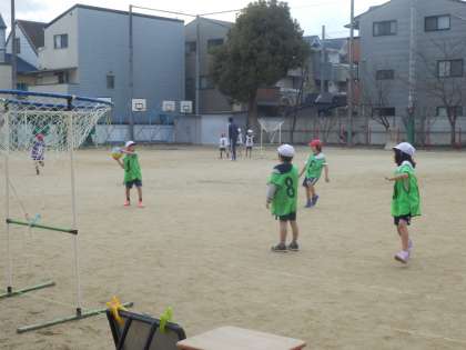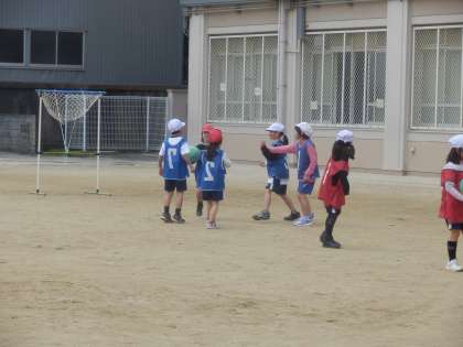 体育で「パスゲーム(2)」を学習しています。チームで声をかけあったり,アドバイスをし合ったりして,パスをつないでいます。どのチームもだんだんと上手になっています。