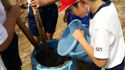 始めに底のないバケツを枠にして砂を入れます。