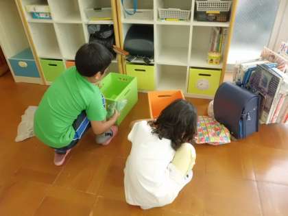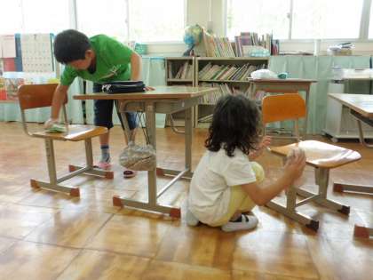 机・椅子・ロッカーを拭き、気持ちよく夏休みを迎えられるように、身の回りを整えました。