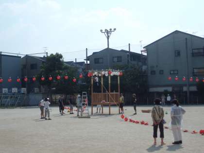暑い中,たくさんの方が準備に来られ,先ほど“やぐら”も建ち,提灯がとりつけられました。