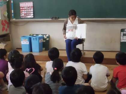 今月のテーマは「たべもの」。食べ物がキーポイントとなるお話を,2年生は楽しそうに聞いていました。