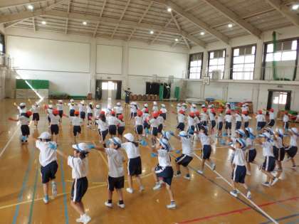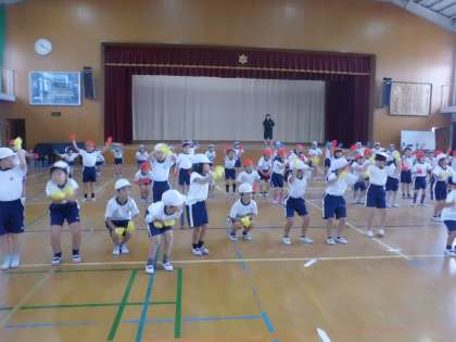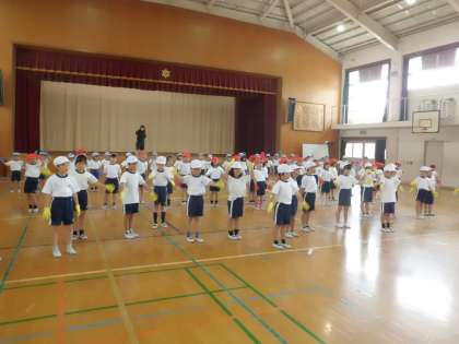 運動会に向けて学習をしているリズム遊びが本格的になってきました。今日は本番同様にそれぞれの色の手袋をつけて練習をしてみました。いつもとちがう雰囲気や感覚に子どもたちは大喜び。リズムに合わせて跳んだり回ったり。本番がとても楽しみですね。