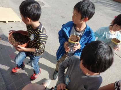 植える前にはしっかりと観察もしました。あさがおの種と比べて,あまりにも小さいので子どもたちは驚いていました。「これが大根になるの?」と,とても不思議そう。さて,あさがおの時のように成功するのでしょうか。