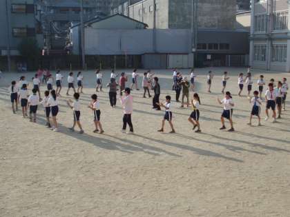 毎年恒例となりました運動会での“もっと京都”。女性会の方と5年生が一緒になって踊ります。今日は,運動会前の最後の練習でした。まず運動場での並び方や入場の仕方などを確認しました。その後,音楽に合わせて踊る練習をしました。練習をするたびに振り付けもよくなってきているので,本番でも楽しく踊る姿を見て下さい。
