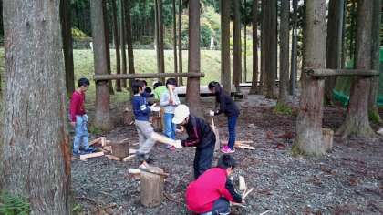 薪割りは二人一組になって協力して上手に割っています。