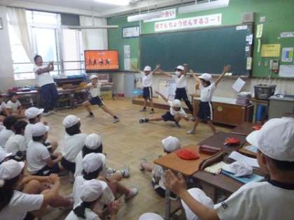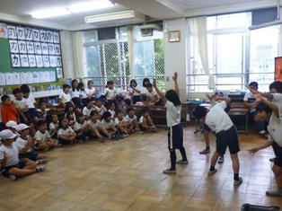 リズムに合わせて身体を動かす楽しさ。学習の締めくくりとして,チームごとに練習してきたダンスをお互いに見せ合いました。