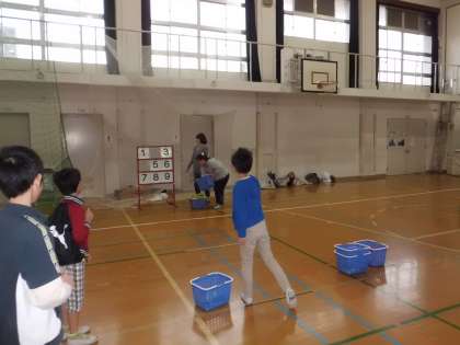 体育館では,魚つりや輪投げ,ストラックアウト,ダブルダッチ体験などを楽しんでいました。