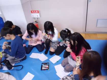 図工室では,木工教室が行われています。低学年は,木製のヨーヨーやコマなどに自分で絵を描いていました。また,高学年では,おやじの会の方に手伝ってもらいながら釘を打ち,本立てや小物入れをつくっていました。