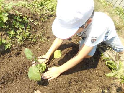 すでに野菜のお世話はお手の物で,テキパキと植える姿に成長を感じます。
