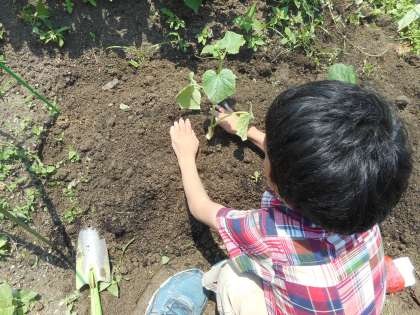 じゃがいも,ネギに続き,次は,きゅうり,なすびを植えました。