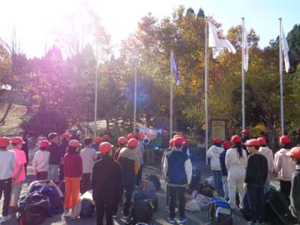 自分たちで作った旗を掲げ、所員さんに「お願いします!」の言葉を伝え、花脊山の家での活動が始まります。