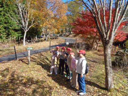 ビンゴカードに書かれた自然界の事象を、体のあらゆる感覚を使ってグループで探し出します。「こけは、ないかな。」「水の流れは、ないかな。」と各グループで山の家の所内を散策しながら巡りました。