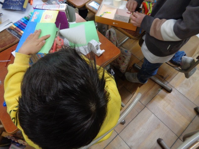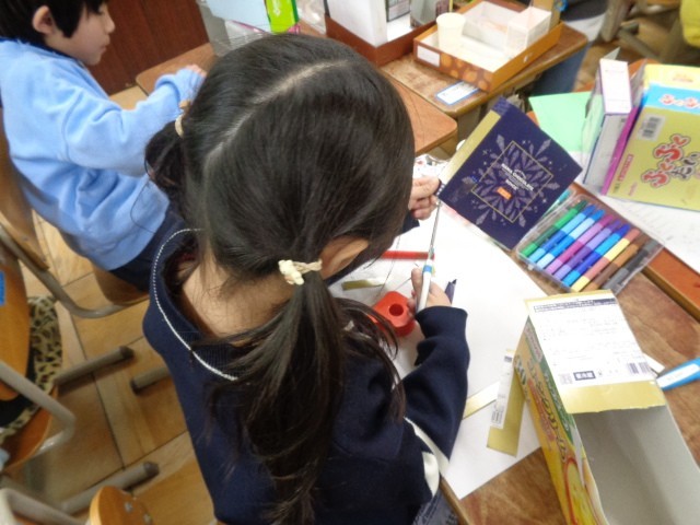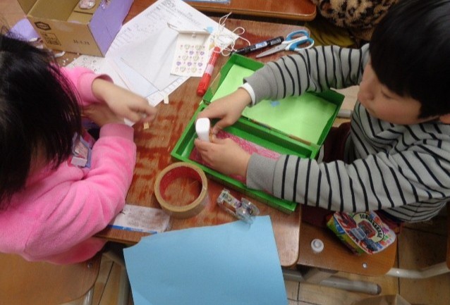 箱と画用紙やリボン、ボタン、ボンドなどを使って、“たいせつ ボックス”を作っています。